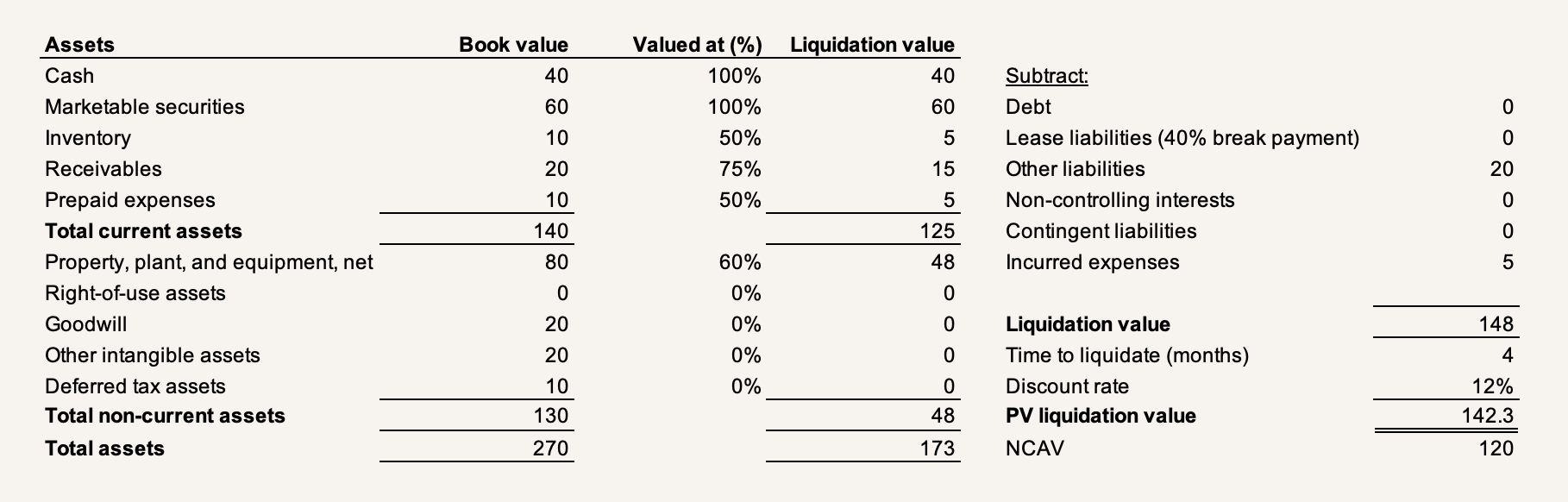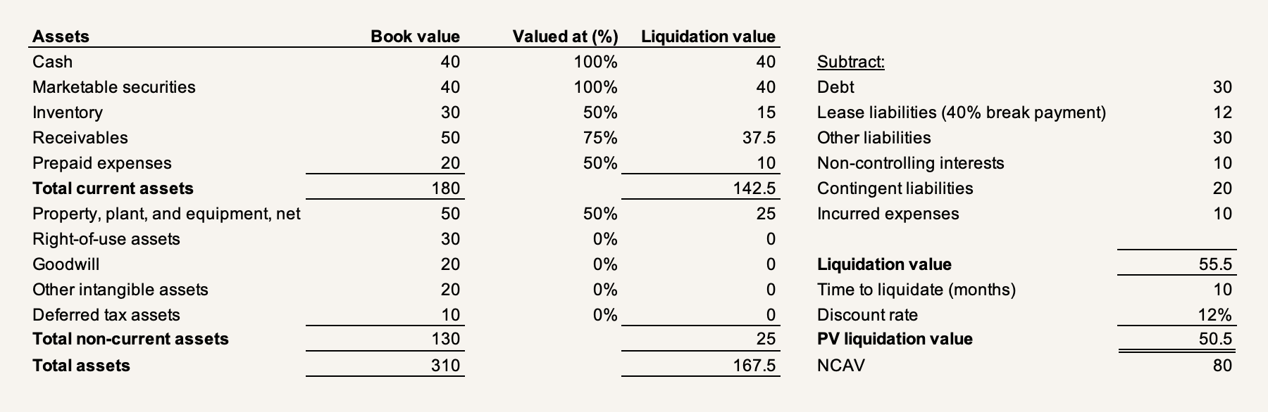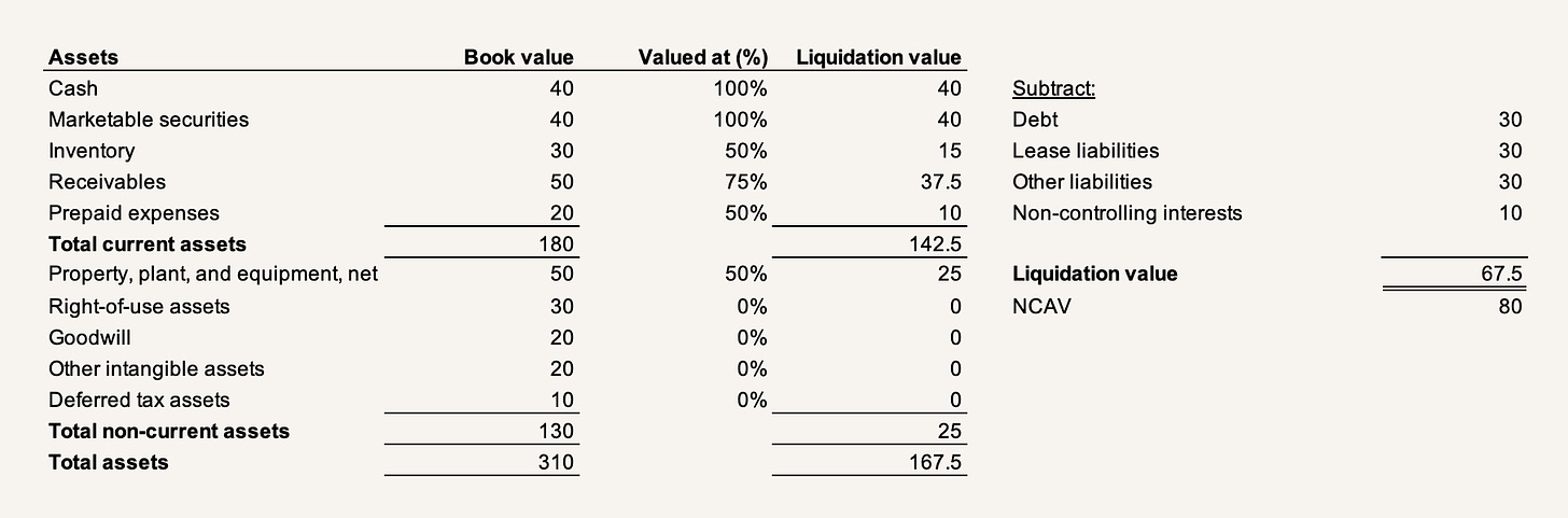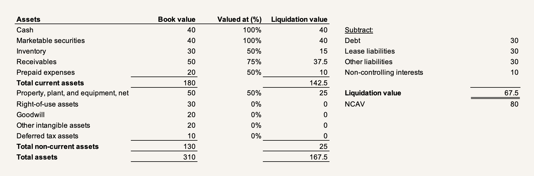 This means that, after digging into a net net, you gotta tweak the formula to get to actual liquidation value and evaluate each asset using common sense. In fact, an often-overlooked aspect of Ben Graham's teachings about net nets is that he often put safeguards in place, getting to a rough liquidation value by discounting receivables by some 25% and inventory by some 50%. By haircutting each asset individually, you might get a working liquidation balance sheet that looks like this (we'll continue tweaking this in the two other dimensions), so far reducing an NCAV of $80 to an actual liquidation value of $67.5: