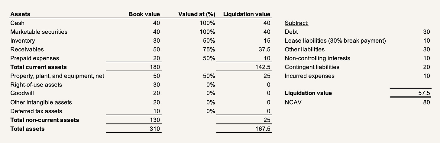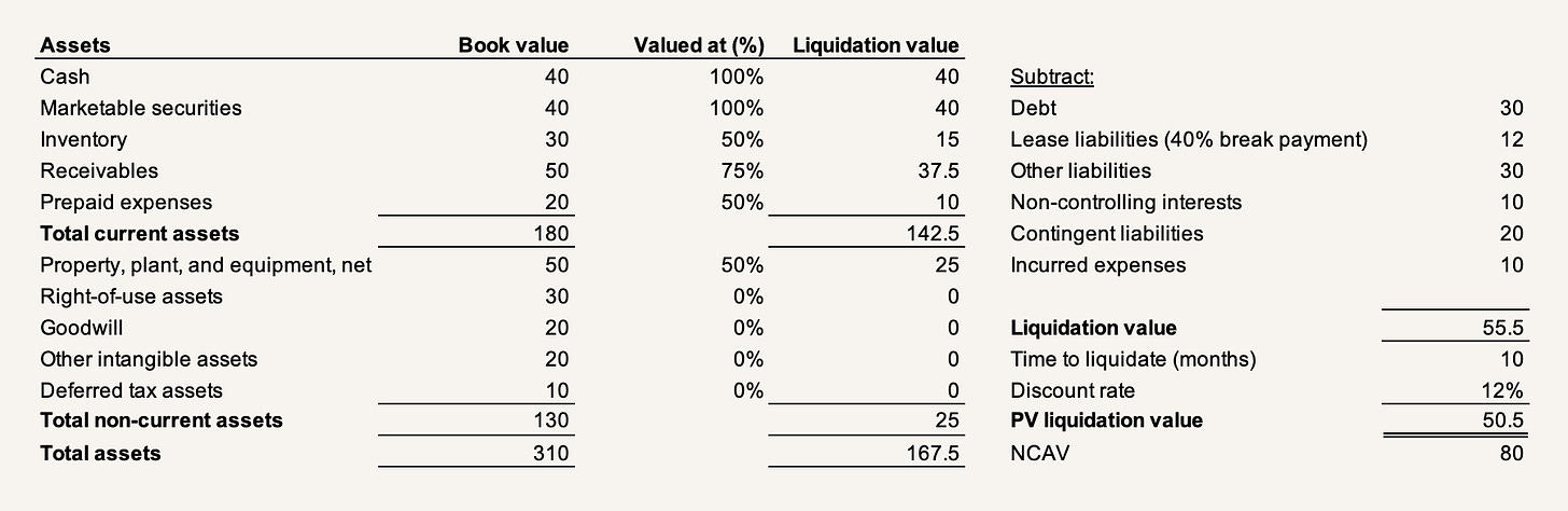 So while NCAV is an easy-to-calculate number as a liquidation proxy, a more realistic liquidation incorporating the insights we've discussed so far may look something like this, reducing what looked like a margin of safety to just about nothing if buying the stock at 60% of NCAV: