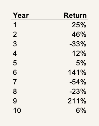 Although your 10-year smoothed result from the return distribution above would have yielded a more-than-acceptable annualized return of 15% — ranking you in top 10% of all investors — it would be diabolically hard to stick to through a full decade.