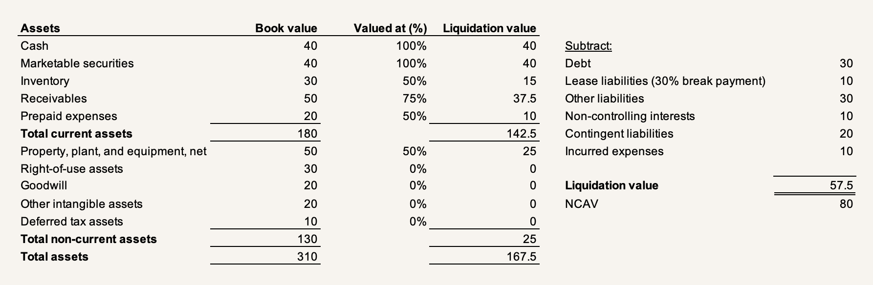 With liability contingencies accounted for, you might now have a working liquidation balance sheet that looks like this, further reducing the original $80 NCAV to a $57.5 liquidation value: