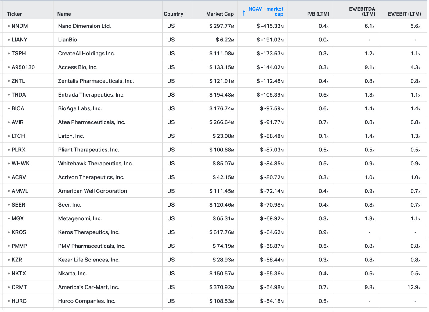 Because in some cases, even cash is not 100%. What a company's cash is worth to you as a shareholder entirely depends on what insiders intend to do with it. One thing you likely noticed from the screen I showed earlier is how “busted” biotech stocks dominate the list. Some of these are pure cash boxes with minimal operations, and they're naturally cash-rich because they just raised the cash but fully intend to burn it until they find a breakthrough discovery. It's the same principle with mineral exploration companies. You should avoid such companies because the market already recognizes there'll never be a natural rebound in the business to recover its liquidation value. That's why you often see busted biotechs trading at negative enterprise values.